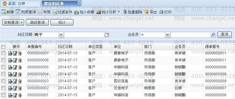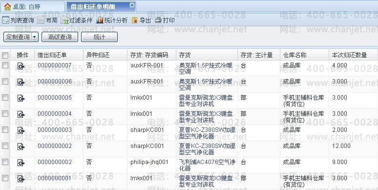 [统计分析]:点击后弹出借出归还单和借出归还单明细选择菜单,统计分析借出归还单及借出归还单明细信息。