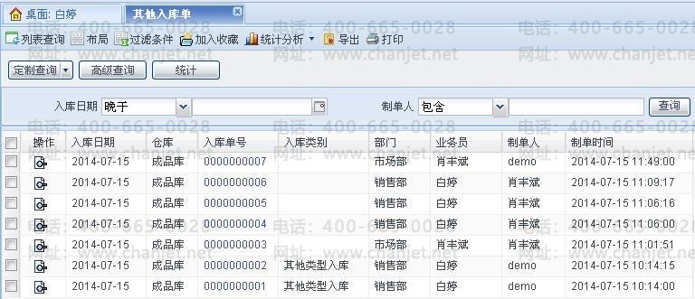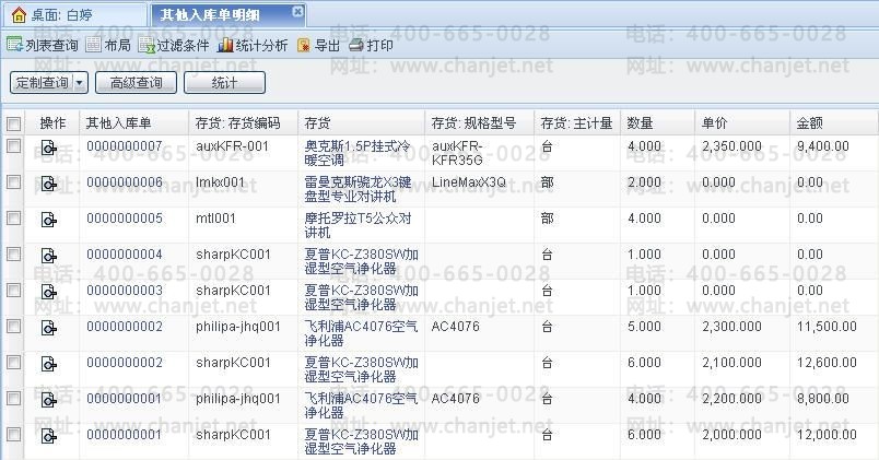[统计分析]:点击后弹出其他入库单和其他入库单明细选择菜单,统计分析其他入库单及其他入库单明细信息。