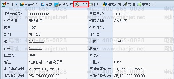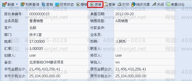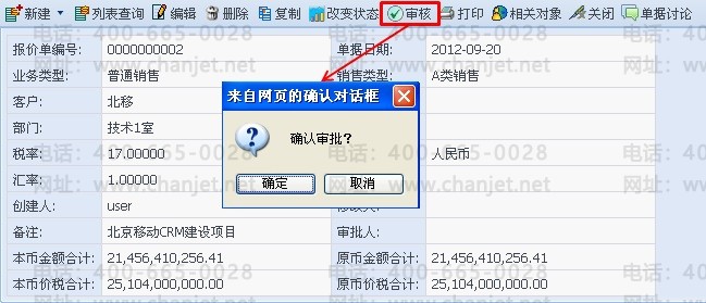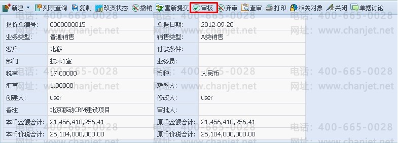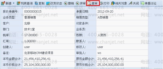 在销售报价单的查看页面,点击“审核”按钮,即完成对销售报价单的审核。