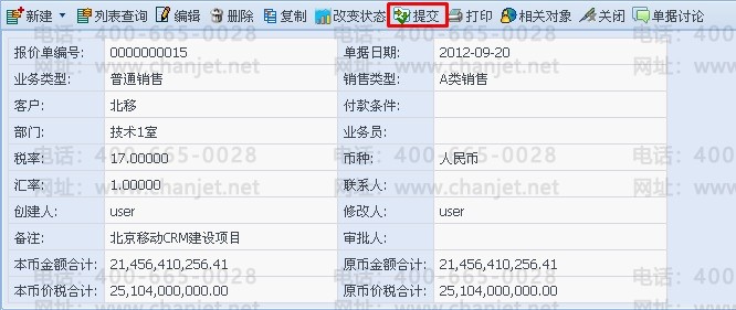 在销售报价单查看页面,点击“提交”按钮,进行流程审核