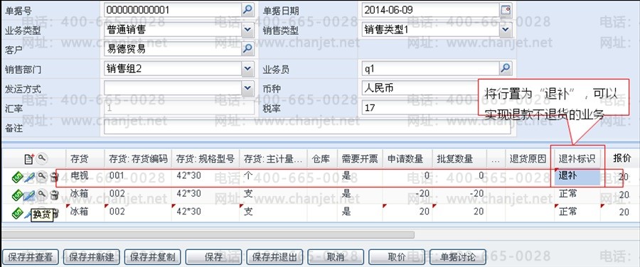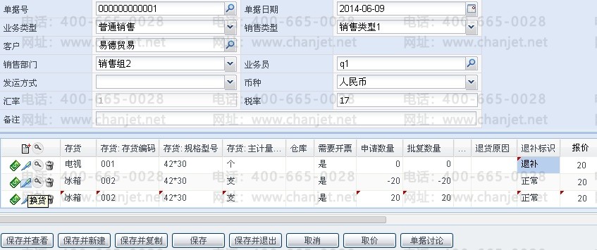 针对退货行点“换货”,自动添加新行,数量取反,存货不可改,需要开票=是,来源关系保留(回写来源发货单/订单)可以手工添加一正数行。不记来源(不回写),存货可改(可以实现异种换货), “需要开票”标志必为“是”