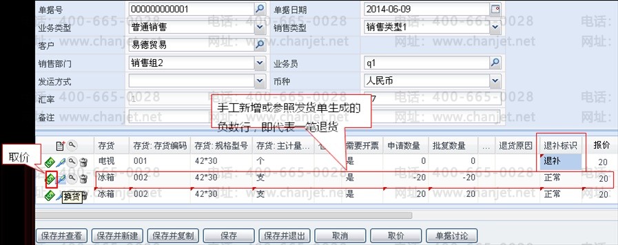 手工新增退货申请或参照发货单生成的负数行,即代表一笔退货