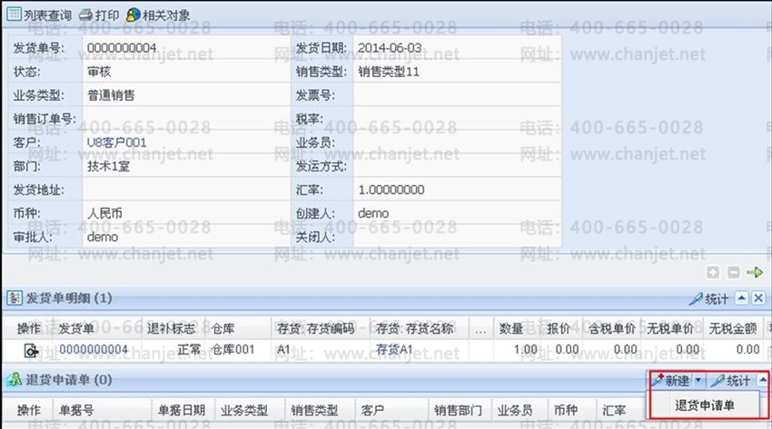根据发货单创建时,带入发货单的信息,申请数量默认等于负的发货数量,可以修改,但申请数量不能超过发货数量。一张发货单可以多次生成退货申请。