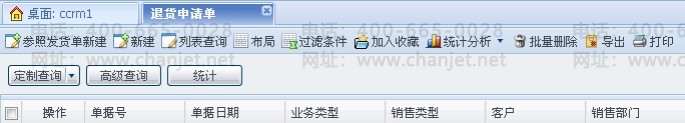 在退货申请列表的工具栏中,点击“参照发货单新建”,则弹出符号退货条件的发货单明细数据,勾选要退货的发货单明细,确定后带入到退货申请的新建页面。