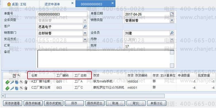订单、发货单、发票、退货申请单表体支持工厂相关的栏目:工厂编码、工厂名称。