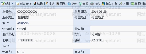 业务类型:单选必填,选择内容为普通销售、分期收款,默认为普通销售。