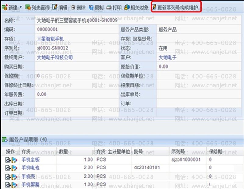 【序列号构成维护】是库存管理模块的一个功能,维护最终成品序列号所包含的核心部件的序列号或批号。手工创建服务产品时,可以自动获取【序列号构成维护】对应的子件信息,并带入到服务产品明细中。