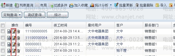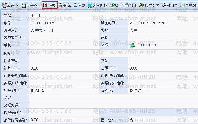 在服务工单查看列表页面中,找到您所关注的服务工单记录,单击该记录的名字或单击操作栏查看 图标均可进入相应服务工单的详细信息查看页面,在详细信息查看页面单击[编辑]按钮即可对服务工单内容进行修改。也可以在列表页面点击