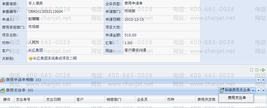 在销售机会的查看页面可以查看并新建相关的费用支出单,如果销售机会定义了工作流,则已审核未关闭的销售机会,可以在相关对象中创建费用支出单,否则销售机会保存后(未关闭)即可创建费用支出单。点击“新建”并选择类型进入费用支出单的新建编辑页面,系统自动携带销售机会的“客户、部门、所有者”等信息到费用支出单上,携带信息可改。