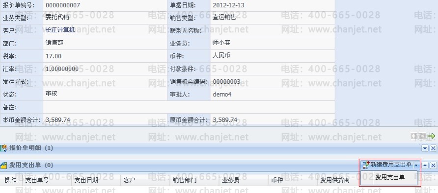 在报价单的查看页面可以查看并新建相关的费用支出单,已审核未关闭的报价单,可以在相关对象中新建费用支出单。点击“新建”并选择类型后进入费用支出单的新建编辑页面,系统自动携带报价单的“客户、联系人、部门、业务员、付款条件”等信息到费用支出单上,携带信息可改。