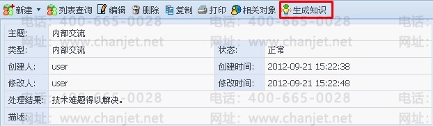 在内部交流信息查看页面点击[生成知识]按钮打开知识管理编辑窗口。