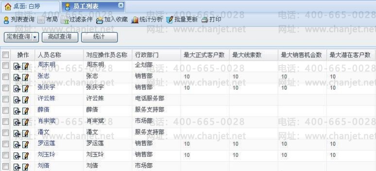 员工信息只能在 U8中创建,CRM 中可查询,能修改部分字段信息(如:可修改联络方式类、上下班时间类、报告给、最大资源数类、资源自动回收规则类字段信息)。在 U8中如何创建员工信息具体可参考 U8的相关使用手册。