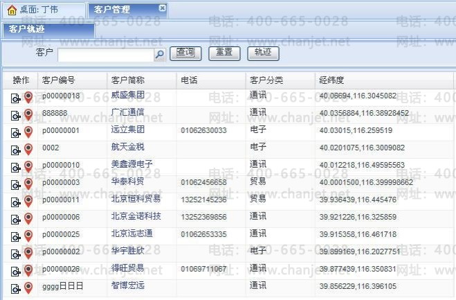 [轨迹]:点击本按钮后,系统打开地图页面,在地图上可以显示出客户的相应位置。