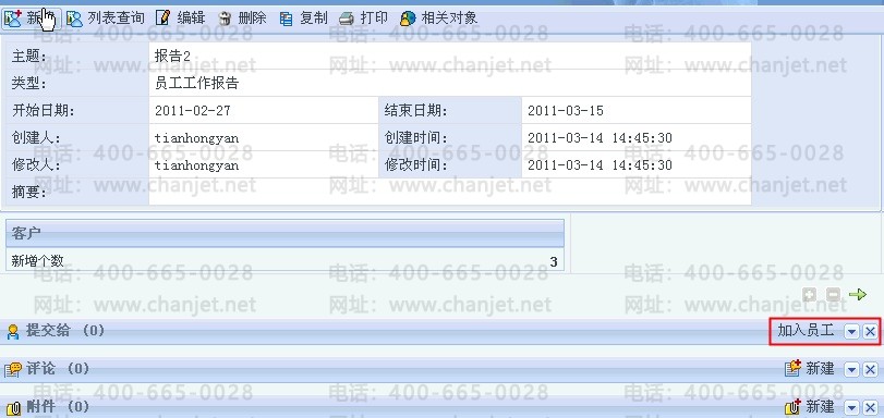 在工作报告的查看页面,点击工作报告相关对象,提交给后的[加入员工]按钮
