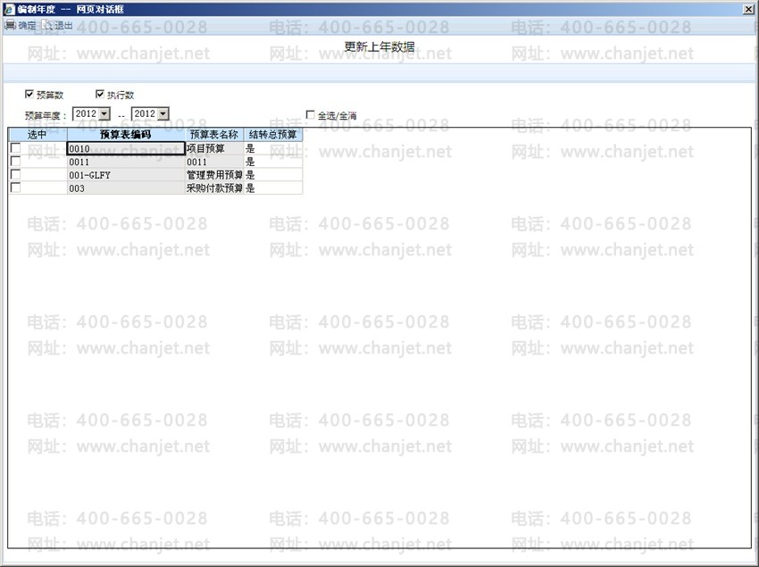 1、点击〖更新上年数据〗按钮,会弹出窗口,选择预算数、实际数,预算年度范围、需要更新的预算表、是否结转总预算(使用总指标的预算表)!如图