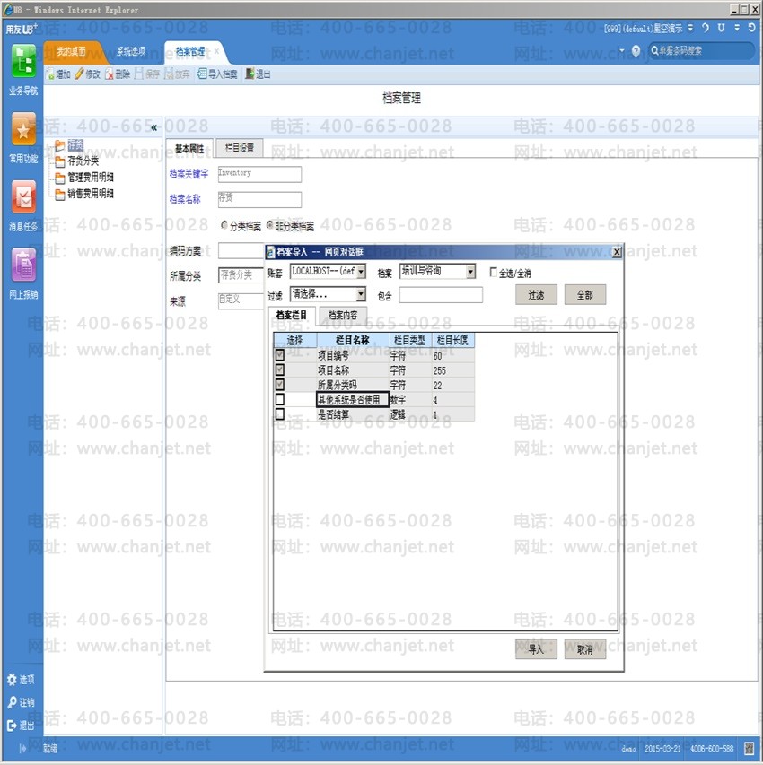 提供导入 U8 平台基础档案类型及基础档案作为本系统的档案类型及档案内容,包括系统预置档案和自定义项档案。自定义项档案的导入提供对 U8 单据头文本类型自定义项(10 个)和 U8 单据体文本类型自定义项(10 个)的导入功能。