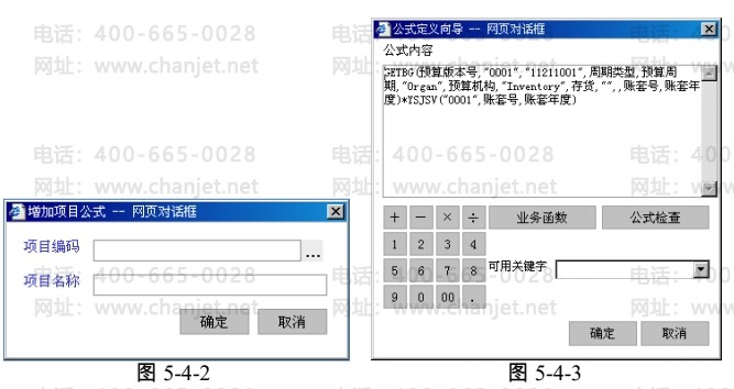 第四步:点击预算公式单元格按钮,系统弹出公式设置界面,如图 5-4-3,点击〖业务函数〗按钮,根据公式定义向导选择函数、参数,确认返回公式设置界面后点击〖公式检查〗检查公式是否合法。