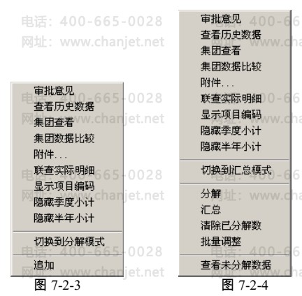 右键功能按钮说明,汇总模式如图 7-2-3,分解模式如图 7-2-4