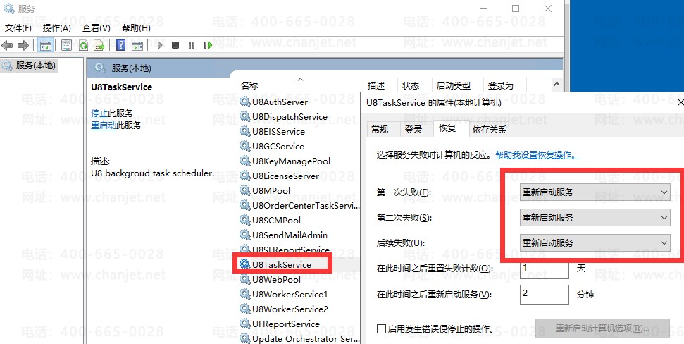 系统中控制面板-管理工具-服务,U8TASKSERVICE-属性-恢复中,选择服务失败时计算机的反应,三个都选择为"重新启动服务"。