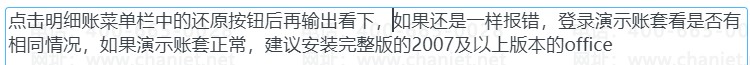 点击明细账菜单栏中的还原按钮后再输出看下,如果还是一样报错,登录演示账套看是否有相同情况,如果演示账套正常,建议安装完整版的2007及以上版本的office