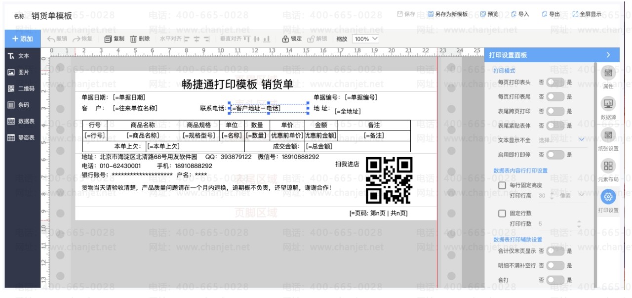 以销货单打印模板为例,系统预置一张模板,可以在此基础上修改设计器分为页眉、表头、表体、表尾、页脚区域。
