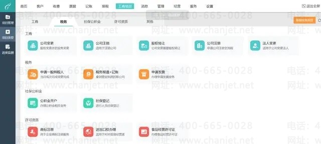 • 系统支持处理公司信息变更、注销、注册、股权转让和法人变更。同时,税务上的转变(例如从小规模纳税人变更为一般纳税人)、税务报道和发票申请也可在软件内快速办理。此外,还包括公积金开户、社保登记以及其他特殊业务如上边注册、进出口权办理、食品经营许可证等。