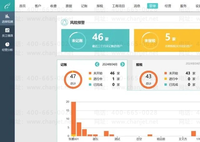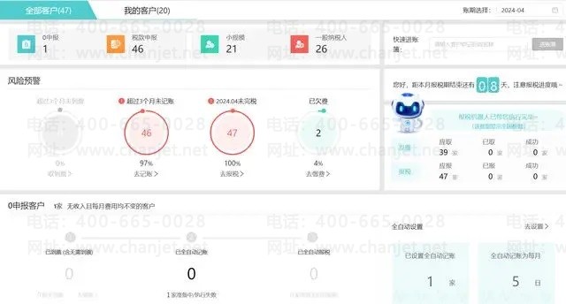 • 系统配备了进度看板,使用户能够清晰查看服务的小规模企业和一般纳税人的数量,以及他们的报税和记账进度。