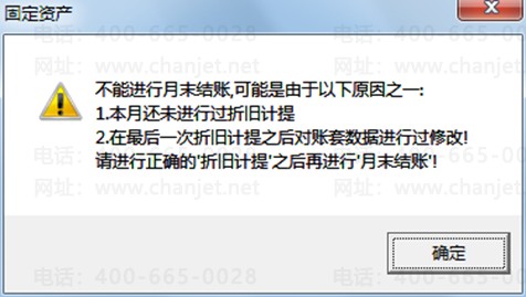 本月没有计提折旧 或本月已经计提折旧又做了调整业务影响了折旧数据,如录入了原始卡片、原值调整、累计折旧调整等。此时在点击月末结账的时候会提示: