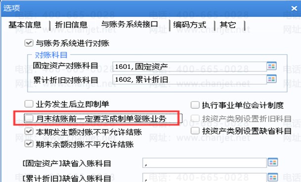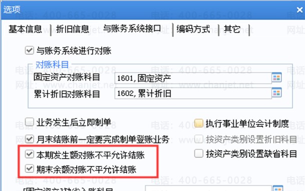 除了计提折旧和制单外,结账时还会校验固定资产与总账数据是否平衡;如果由于特殊原因或者发生不平,不做两系统的对账,可通过调整选项允许对账不平可以结账。