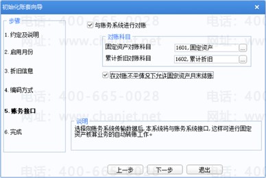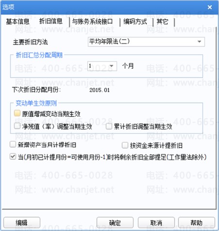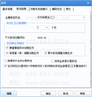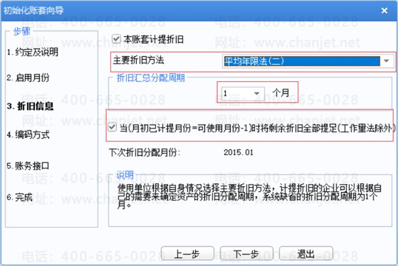 可在选择主要折旧方法以及折旧汇总分配周期。此处可以在初始化设置完成后在固定资产设置选项中修改。