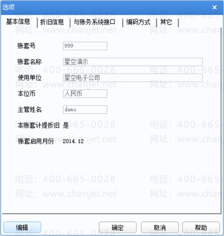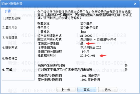 6.完成:红色箭头处代表无法修改的信息,且账套名称、账套号、使用单位、本位币、主管姓名等无法修改。其他的初始化设置在固定资产-设置-选项中可以修改。
