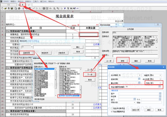 3)、本期金额公式设置步骤:选中C6单元格-点击菜单栏上【fx】按钮-【函数向导】中函数名选择【现金流量项目金额XJLL】