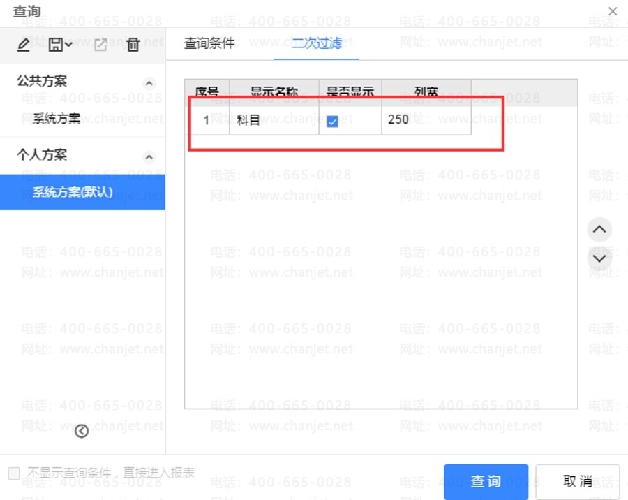 STEP2:若导出时想一个科目显示在一页,可以在【表头二次过滤项】中勾选科目;