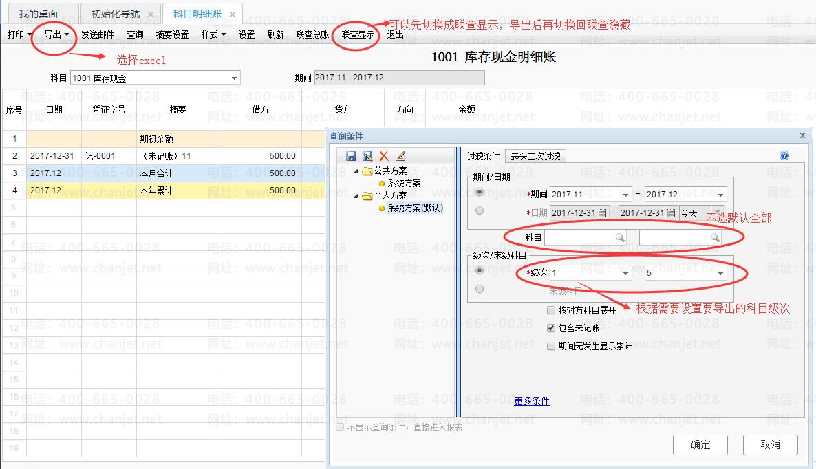 STEP3:查询结果会将一个科目显示在一个页面上,表头科目下拉可以选择其他过滤的科目,此时点击【导出excel】,就会将所有科目导出在一个excel中,并且各科目分页签显示。
