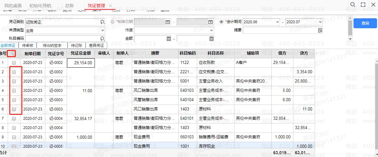 2.在【全部凭证】的页签下,勾选上需要取消记账的凭证记录,同时按【CTRL+ALT+H】进行反记账;