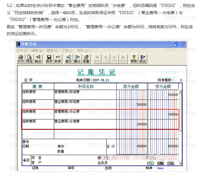 2. 本功能只能结转一个科目的期末余额。转出科目在生成的转账凭证上,会在该科目的科目性质相反的方向反映。如本例中,管理费用是个“支出”科目,即借方科 目,在转账凭证上,从贷方转出。如果“管理费用”科目在结转前,是个贷方余额,则生成的转账凭证上,管理费用科目显示贷方红字。