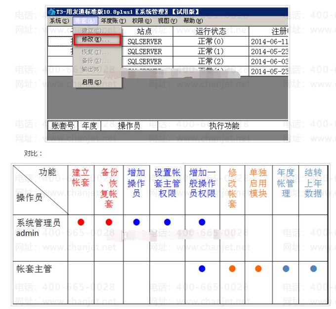 登陆系统管理可以修改某账套的设置,对操作员授权