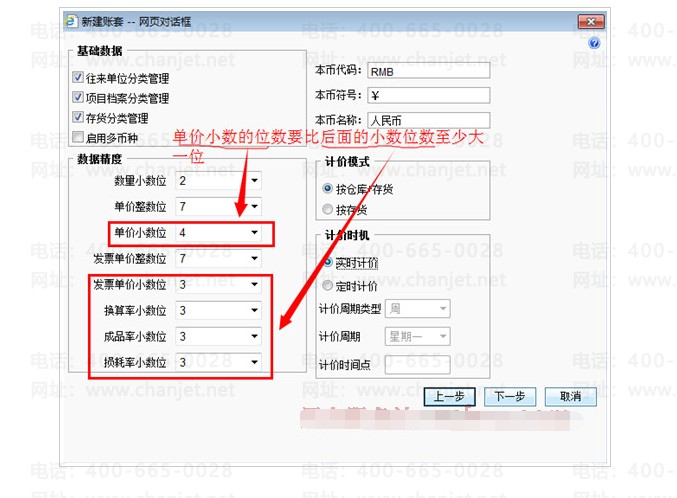 解决方法:在建账的时候,数据精度那边,单价小数位要比后面的其他小数位大至少一位,如下图所示: