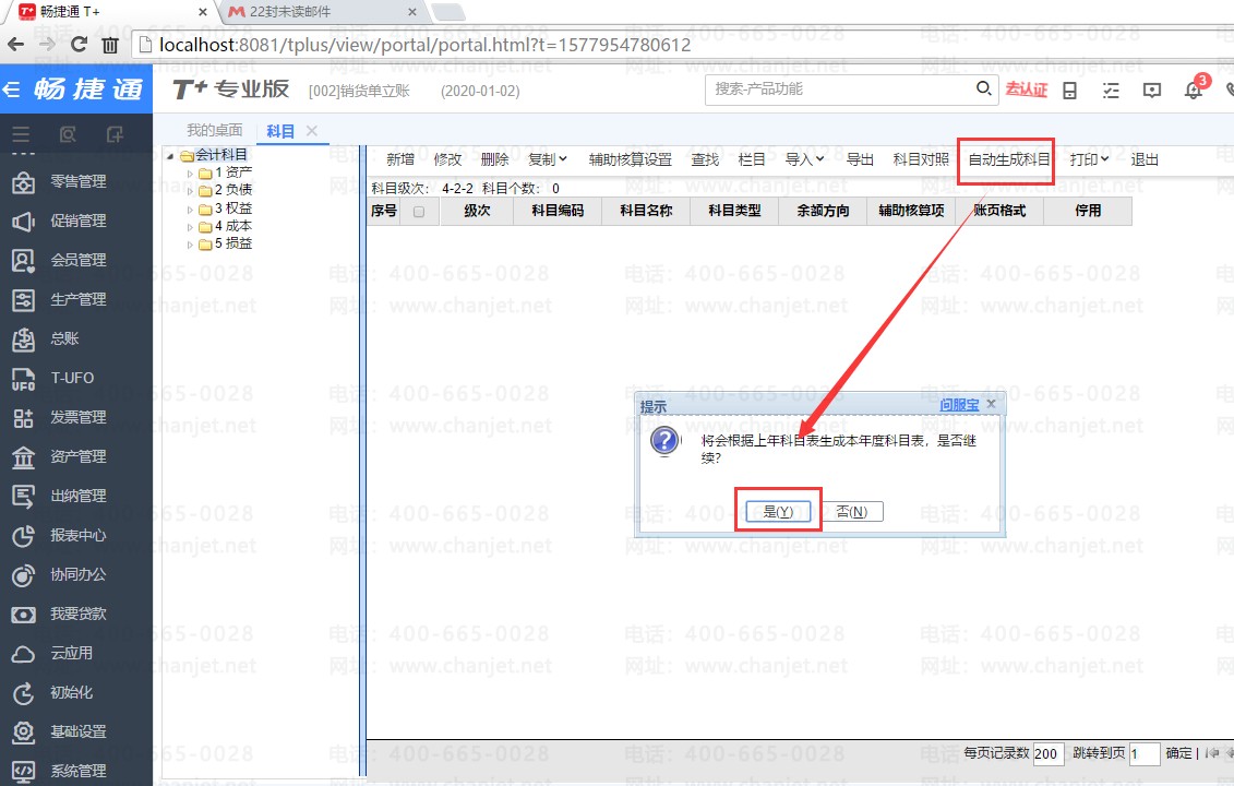 STEP6:如果客户那有财务账,需要做2020年的凭证,则还需要点“基础设置”-“科目”-“自动生成科目”,则会把上年度的科目带到本年度;