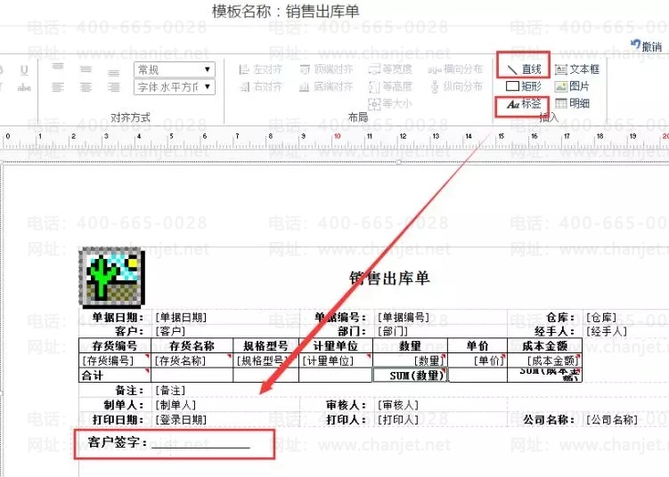 A:可以通过增加一个【标签】来实现,在打印模板的合适位置,点击右上方【标签】,录入固定文字如“客户签字:”,再点击右上角【直线】,在签字处后方画一根线;