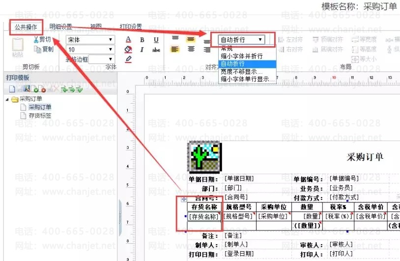 Q:出库单据上存货的名称非常复杂,包含规格型号等信息,字数有20多个,打印时显示不完整,如何让打印内容折行显示?