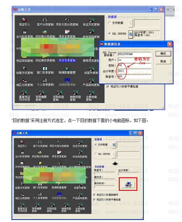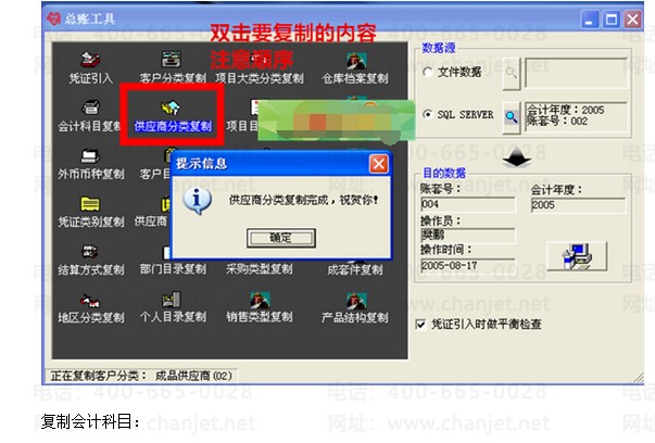 1、把001帐套的基础数据和会计凭证复制到002帐套,则001帐套为数据源,002帐套为目的数据