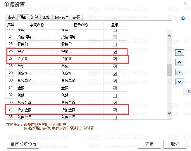 设置:打开”进货单”,表头点”操作”菜单”设置”,单据设置选项,明细设置,把”报价”"折扣”"折扣金额”字段显示出来。