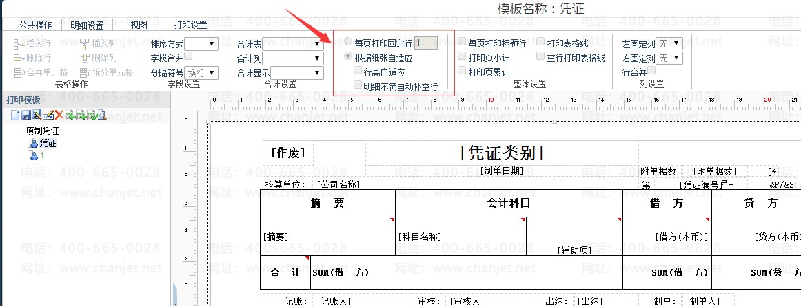 解决方案:填制凭证界面点”打印模板设置”,明细设置,每页打印固定行数。