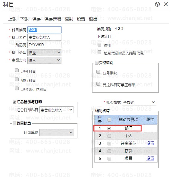 第二步、填制凭证,主营业务收入(5001) 分别录入部门1和部门2: