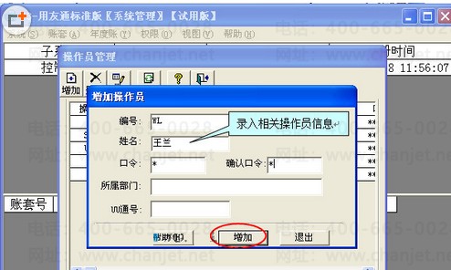 首先,为账套增加操作员:系统管理→系统→注册→用户名admin 密码为空→确定→权限→操作员→增加→编号为01 姓名为会计的全名 可以设定自己的口令也可暂为空,