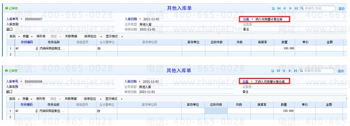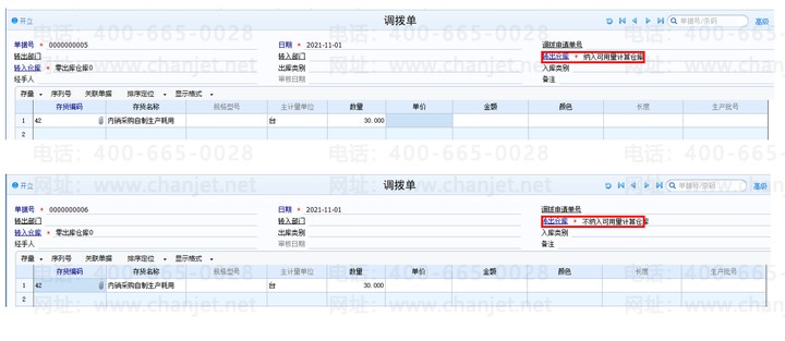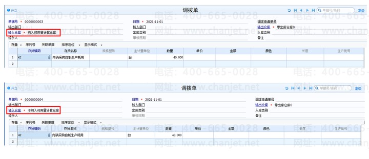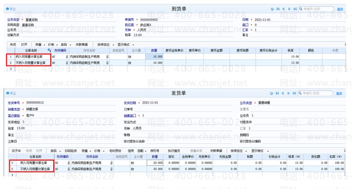 1、纳入可用量计算和不纳入可用量计算的仓库分别做其他入库单100个、到货单10个、发货单20个、调拨出库30个、调拨入库40个