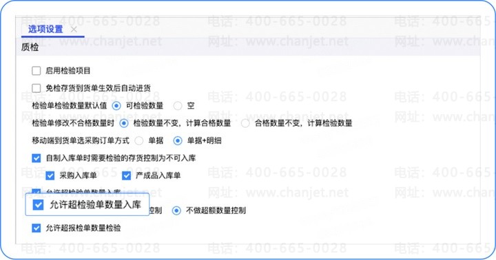 启用选项后,产成品入库单、采购入库单数量可超检验单检验数量。