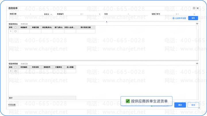 采购入库单选检验单界面增加“按供应商拆单生入库单”选项,勾选后可按选择单据的供应商拆分生成采购入库单。