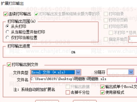 3、勾选连续打印输出,勾选打印输出到文件,勾选输出成单个Excel文件,勾选使用新格式,输入路径,点击输出